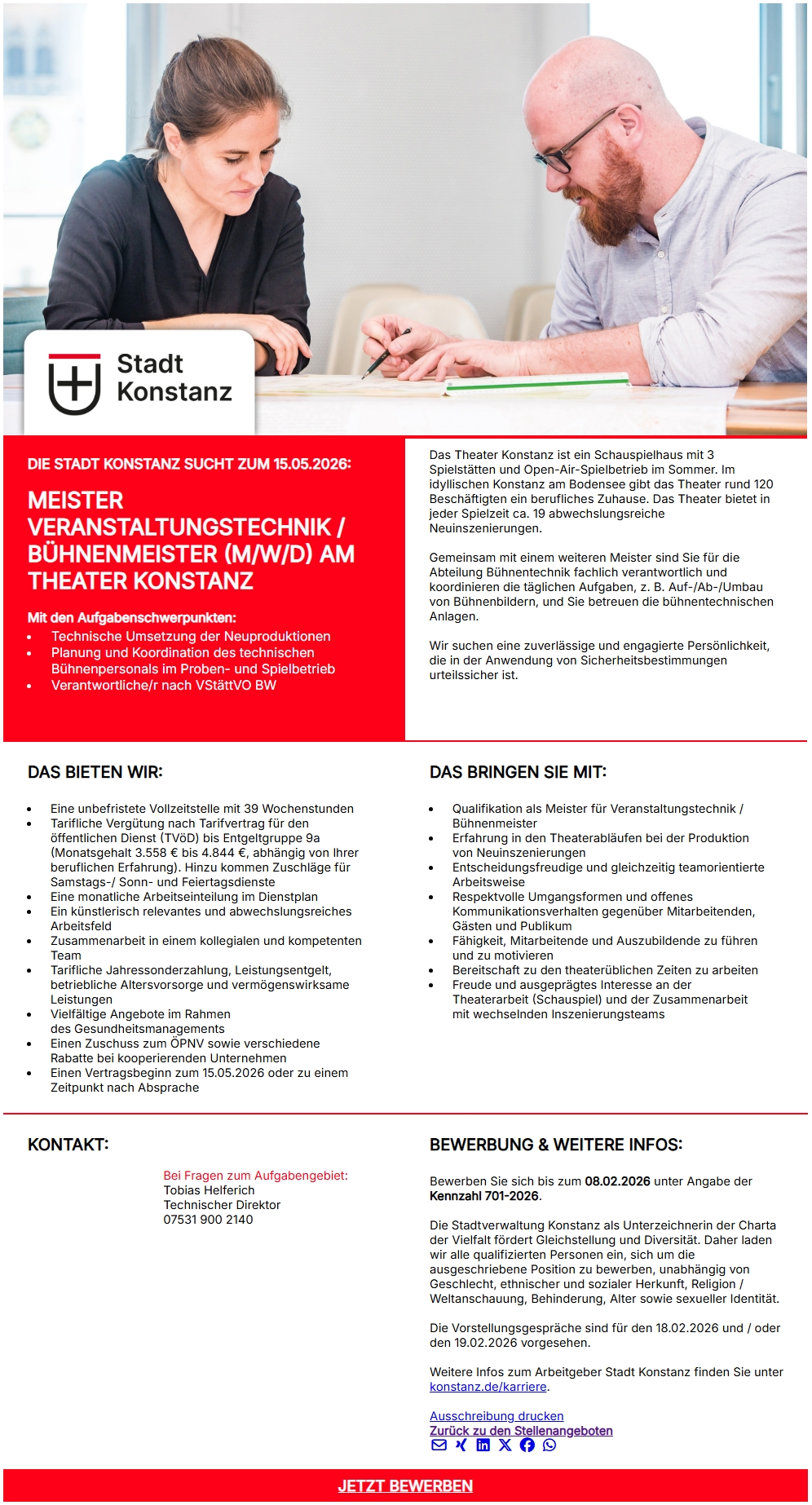 Bei Fragen zum Bewerbungsprozess und für weitere Informationen zum Online-Portal steht Alexander Ohm | Personal- und Organisationsamt der Stadt Konstanz unter 07531 900-2267 | Alexander.Ohm@konstanz.de zur Verfügung. Bei Fragen zum Aufgabengebiet wenden Sie sich direkt an Tobias Helferich | Technischer Direktor unter 07531900 2140 | Tobias.Helferich@konstanz.de